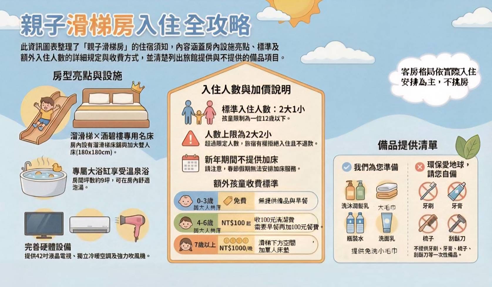 7歲以上需加床,加床為滑梯下方加單人床墊,加床費1000元/晚。(加床費包含備品及早餐)訂房網訂房加床費1200元/晚。新年期間不提供加床服務。