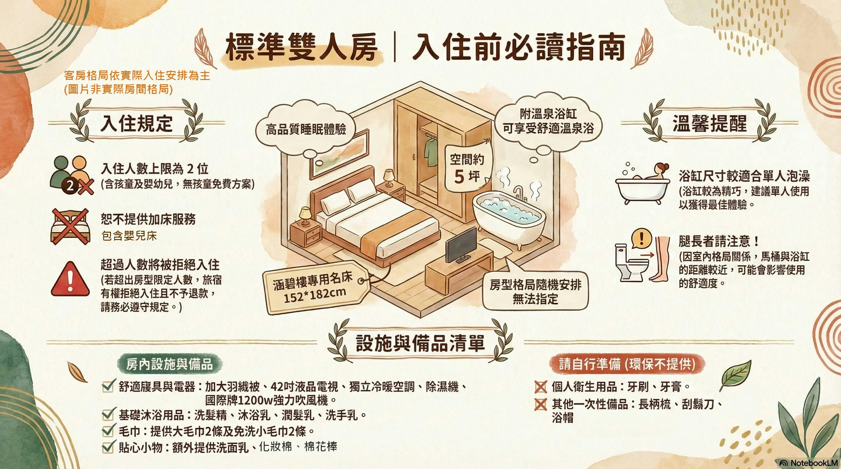 標準雙人房空間約5坪,恰到好處的二人空間,有1張雙人床,泡湯浴池空間也開了對外窗,可以享受慢漫溫泉的時光。房間內的設備有桌椅、42吋液晶電視、靜音冰箱、冷暖空調、茶杯、室內拖鞋、棉花棒、化妝棉、沐浴用品採用天然有機沐浴乳、洗髮精、潤髮乳、提供風力強的吹風機..等貼心無極限的備品,如在家般方便舒適,床墊嚴選五星級飯店涵碧樓專用床,尺寸為150X180cm,讓您出外旅遊也能享受慢舒眠。